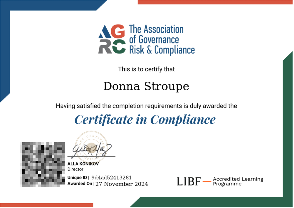 我正在寻找合规证书来提高我的资历,但最重要的是,学习合规的基础知识。我研究了许多组织和合规计划。我找到了 AGRC 计划,并最终选择了他们作为我的认证。我很高兴我做到了!该计划具有成本效益,但更重要的是,它是全面和严格的。它涵盖了合规的背景、合规和合规计划背后的基本原理,以及监管框架和规则本身。它本质上是全球性的。它涵盖了非洲、欧洲、中东、亚洲以及英国和美国在合规方法上的异同。信息很详尽,但组织得很好。该程序和测试很实用,并且立即适用于我的工作。它为我担任公司首席合规官提供了基础。