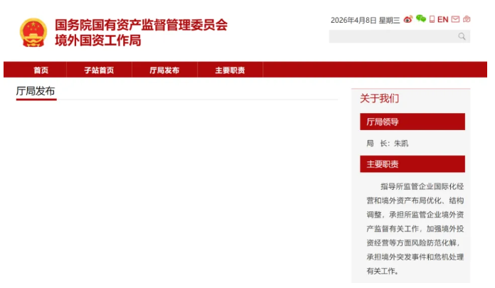 国资委官网已更新境外国资工作局的相关信息。官网显示,境外国资工作局局长为朱凯,下设机构包括国际化经营处、风险防范处、监督治理处、应急管理处。