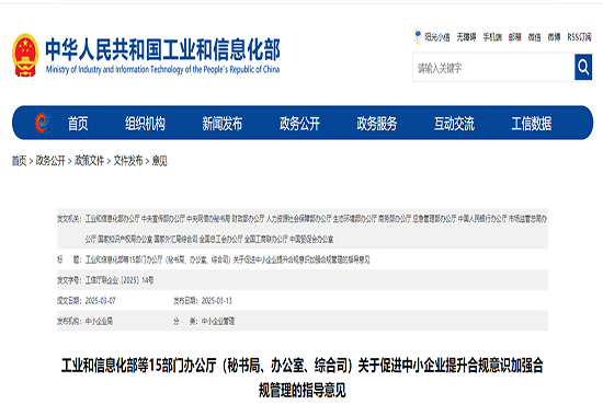 工业和信息化部等15部门办公厅(秘书局、办公室、综合司)关于促进中小企业提升合规意识加强合规管理的指导意见